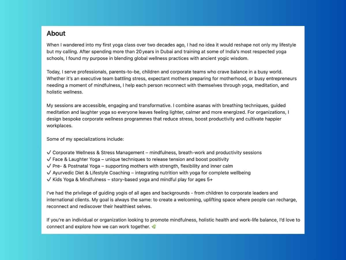 In the wellness industry, your "vibe" is your currency. For this client, having no LinkedIn profile meant she was practically invisible to corporate partners and high-level collaborators.